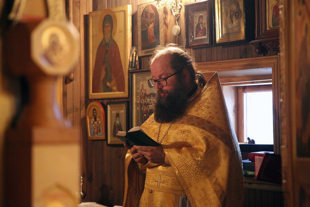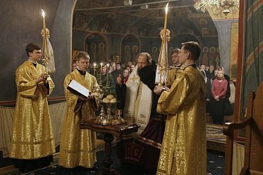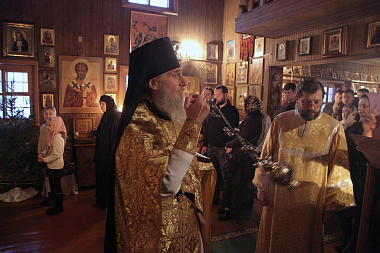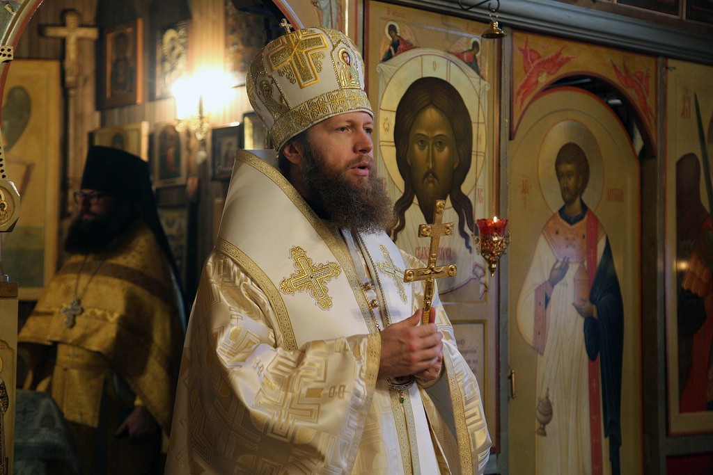 Его Преосвященству сослужили настоятель подворья игумен Серафим (Симонов) и игумен Владимир (Мельников).