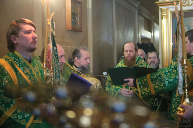 Его Преосвященству сослужили: епископ Ванинский и Переяславский Савватий; клирик монастыря митрофорный протоиерей Николай Сухов; председатель Комиссии по образованию и катехизации викариатства Новых территорий г. Москвы протоиерей Сергий Махонин, настоятель Смоленской часовни в дер. Елизарово (приписной к Свято-Духовскому храму пос. Первомайского); благочинный Одигитриевского округа иерей Петр Панов; клирик храма Казанской иконы Божией Матери в дер. Пучково иерей Олег Гаджиев.