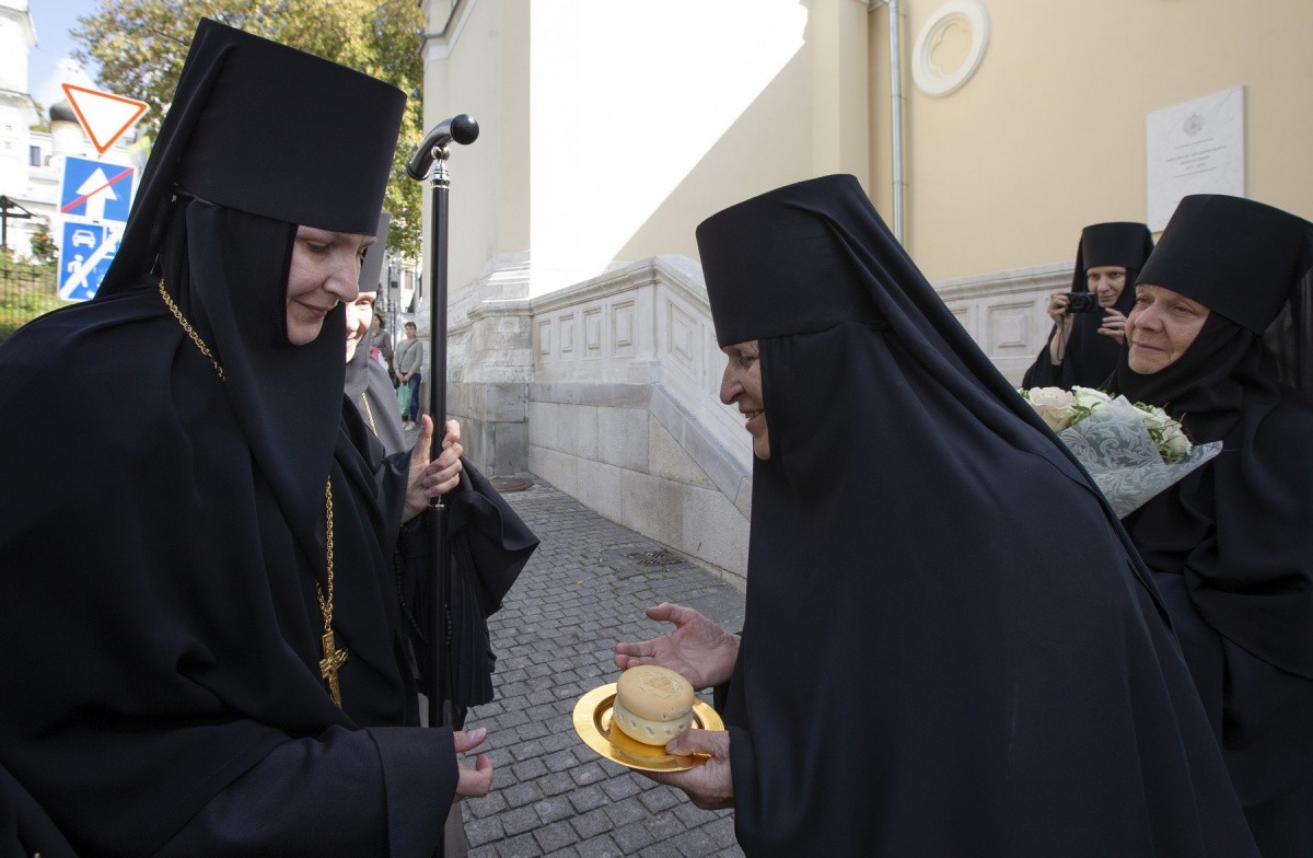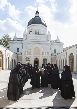Сестры и клир обители встретили игумению Елисавету праздничным колокольным звоном и цветами.