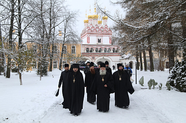 Наместник монастыря архимандрит Сергий (Воронков) провел высоких гостей в храм во имя Преподобного Иосифа Волоцкого, где они помолились у мощей святого основателя обители, затем в Успенском соборе совершили заупокойную литию по приснопоминаемым Святейшему Патриарху Московскому и всея Руси Алексию II, митрополиту Волоколамскому и Юрьевскому Питириму (Нечаеву) и почившей братии монастыря.