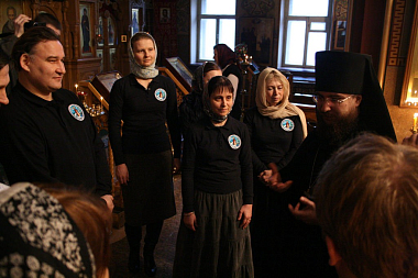 По окончании Божественной литургии миссионеры сфотографировались с духовником братства и настоятелем храма Прпп. Сергия и Германа Валаамских игуменом Иосифом (Крюковым) и преподнесли Его Высокопреподобию по случаю праздника букет цветов.