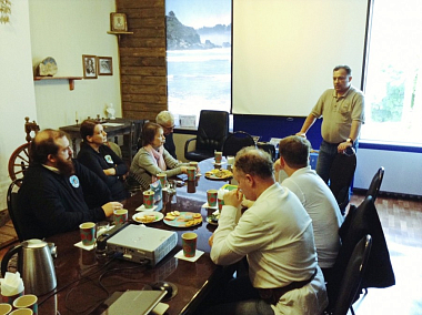 В этот же день участники поездки встретились с сотрудниками Миссионерского отдела епархии, которые рассказали о миссионерских и просветительских проектах Рязани, поделились своим видением миссионерской работы на приходах. В заключение встречи Дмитрий Захаркин выступил с сообщением о служении братства, а также продемонстрировал специально привезенные миссионерские материалы. Членами братства была предложена инициатива о включении имени преподобного Германа Аляскинского в список Собора Рязанских святых. После посещения Миссионерского отдела епархии группу ждала экскурсия местного краеведа по святым местам Рязани.