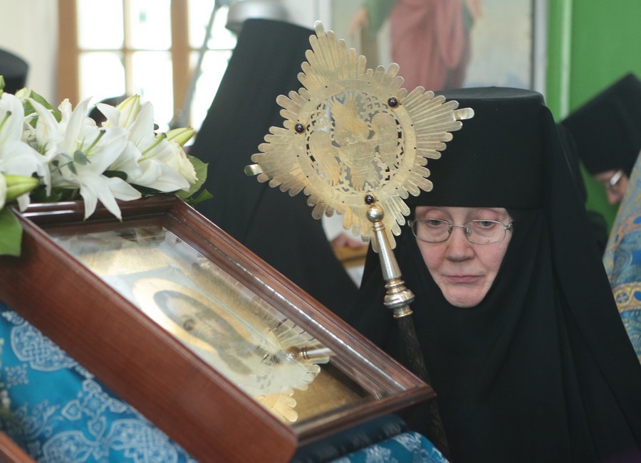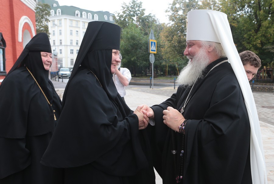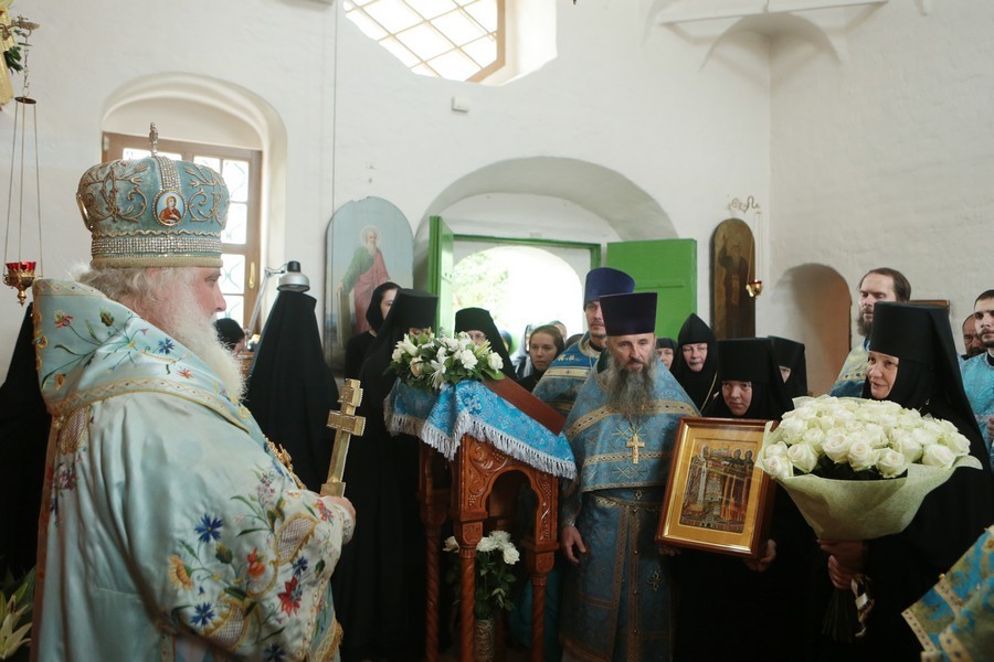 Затем игумения Иулиания в приветственном слове поблагодарила митрополита Арсения за совершенное богослужение и преподнесла в дар икону с изображением святителя Алексия, благословляющего прпп. Иулианию и Евпраксию Московских на создание Зачатьевского монастыря.
