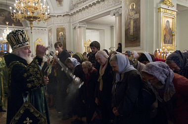 Отслужив вечерню и литию, за утреней по прочтении Евангелия и исполнения величания празднуемому святому во время чтения канонов благоверного князя Даниила Московского владыка Арсений совершил помазание елеем молящихся в храме.