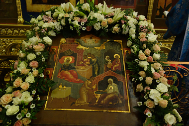 «Мы воспоминаем чудесное и радостное событие, когда Бог даровал престарелым и неплодным родителям Дитя, и через это маленькое Божие создание устроилось спасение всего мира. Многократно в течение богослужения мы слышали о поношении бесчадства, которое испытывали праведные Иоаким и Анна. По понятиям того времени окружающие люди считали, что они имели какой-то тайный грех, и Господь их наказывает. И праведные, святые, ни в чем не повинные люди много претерпели от соседей и сродников, не одно десятилетие укорявших их за то, что у них нет благословения, которое обычно имеют семьи. Но прошло время, и на удивление всем в преклонном возрасте святые Иоаким и Анна стали родителями Божией Матери.