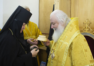 Матушка Иулиания вручила митрополиту Арсению в дар панагию с изображением Покрова Пресвятой Богородицы.