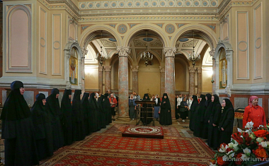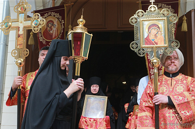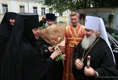 Затем казначея Иоанновского монастыря монахиня Анувия (Виноградова) зачитала поздравительное и благодарственное слово настоятельницы обители игумении Афанасии (Грошевой), адресованное участникам богослужения. Матушка Анувия от имени Ее Высокопреподобия и насельниц монастыря преподнесла владыкам в дар иконы, написанные сестрами обители.