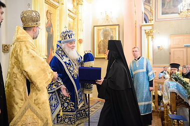 В дар Высокопреосвященнейшим владыкам игумения Феофания преподнесла архиерейское кадило и цветы.