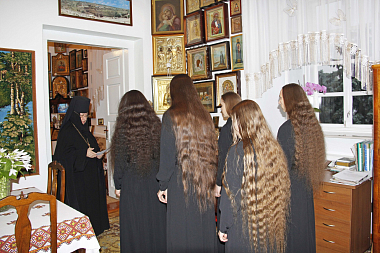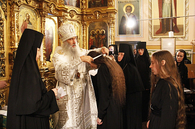 На следующий день по прочтении Часов Его Высокопреосвященство совершил иноческий постриг шести сестер обители и возглавил Божественную литургию, за которой новопостриженные сестры причастились Святых Христовых Таин.