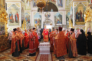 Его Высокопреосвященству сослужило монастырское и местное духовенство.