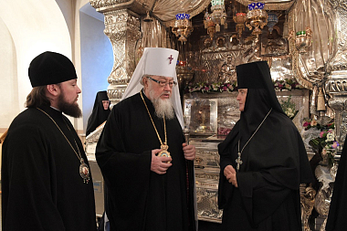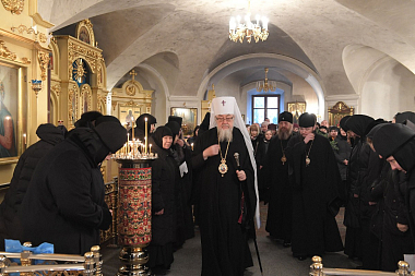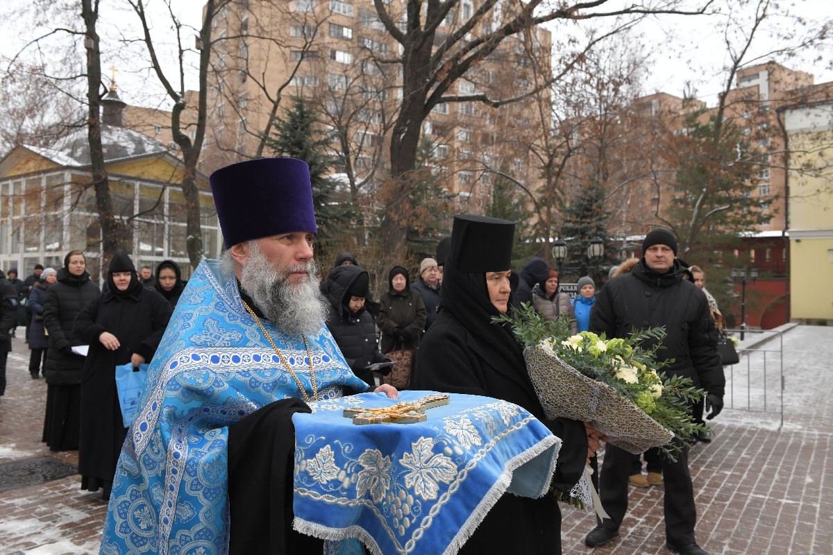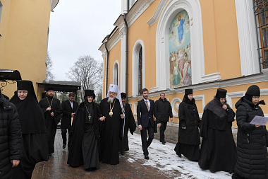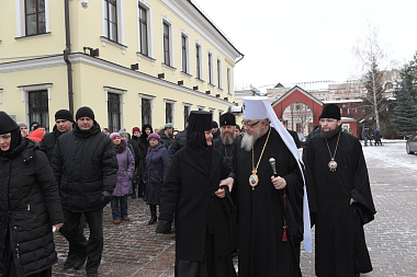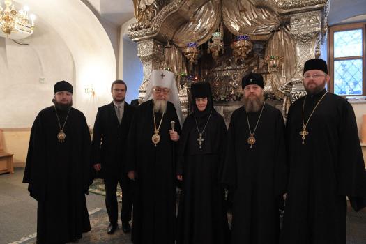 У Святых врат обители делегацию встречала настоятельница Покровского ставропигиального женского монастыря игумения Феофания (Мискина) с сестрами.