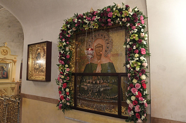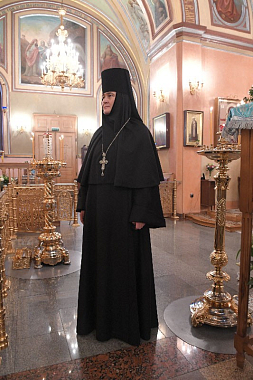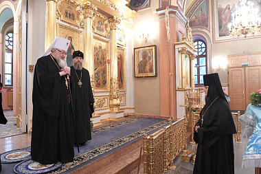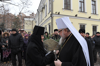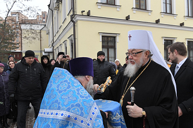 Затем игумения Феофания в дар Митрополиту Савве преподнесла икону святой праведной блаженной Матроны Московской, памятные подарки и четки.