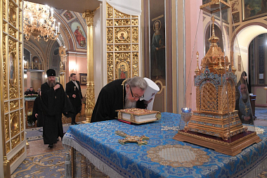 Гости проследовали в храм Покрова Пресвятой Богородицы, где поклонились мощам святой праведной блаженной Матроны Московской и прочитали молитву святой.