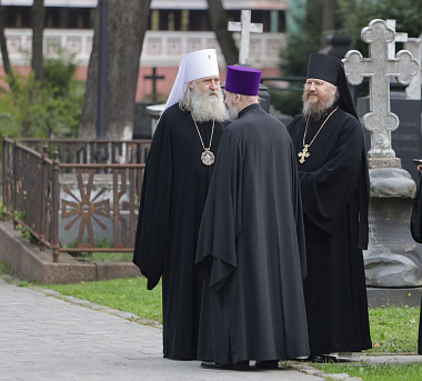 Его Высокопреосвященству сослужили: митрополит Каширский Феогност, председатель Синодального отдела по монастырям и монашеству, наместник Донского ставропигиального монастыря; епископ Сергиево-Посадский и Дмитровский Фома, наместник Свято-Троицкой Сергиевой лавры; протопресвитер Владимир Диваков, секретарь Патриарха Московского и всея Руси по г. Москве; архимандрит Павел (Кривоногов), наместник Саввино-Сторожевского ставропигиального монастыря.