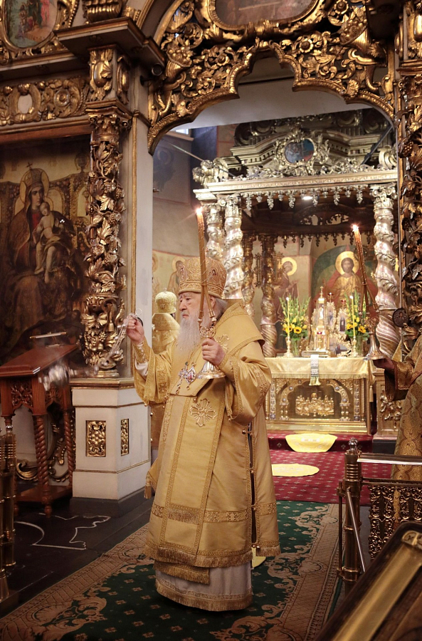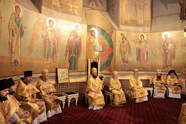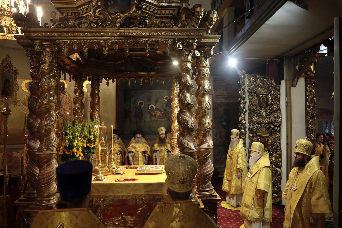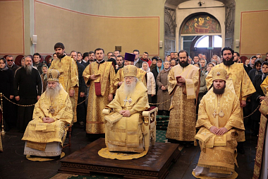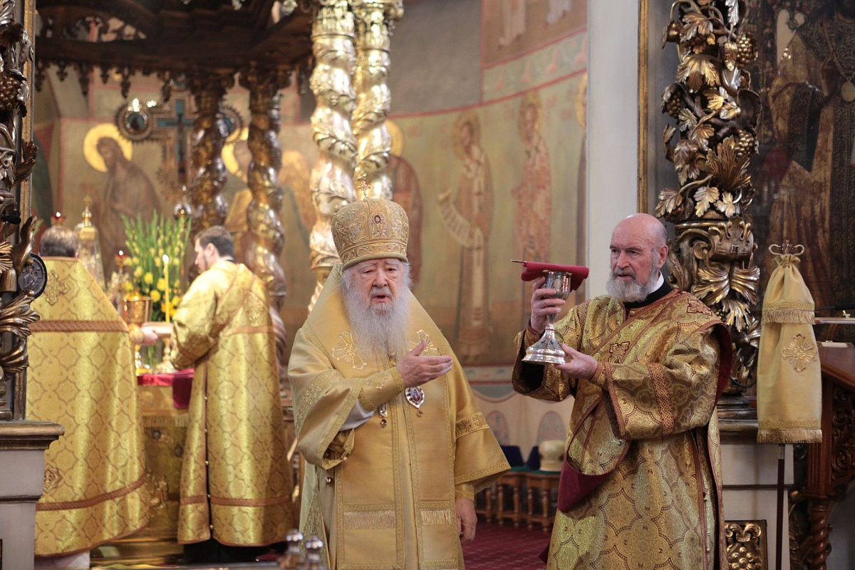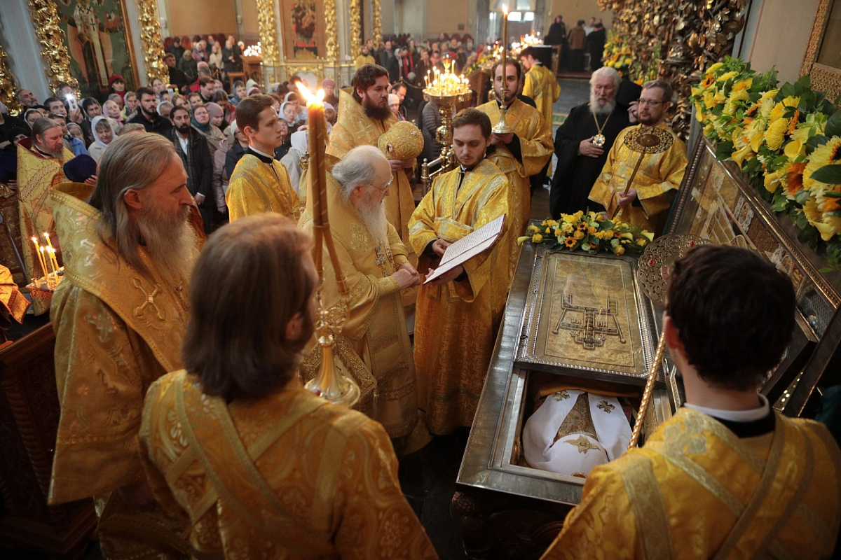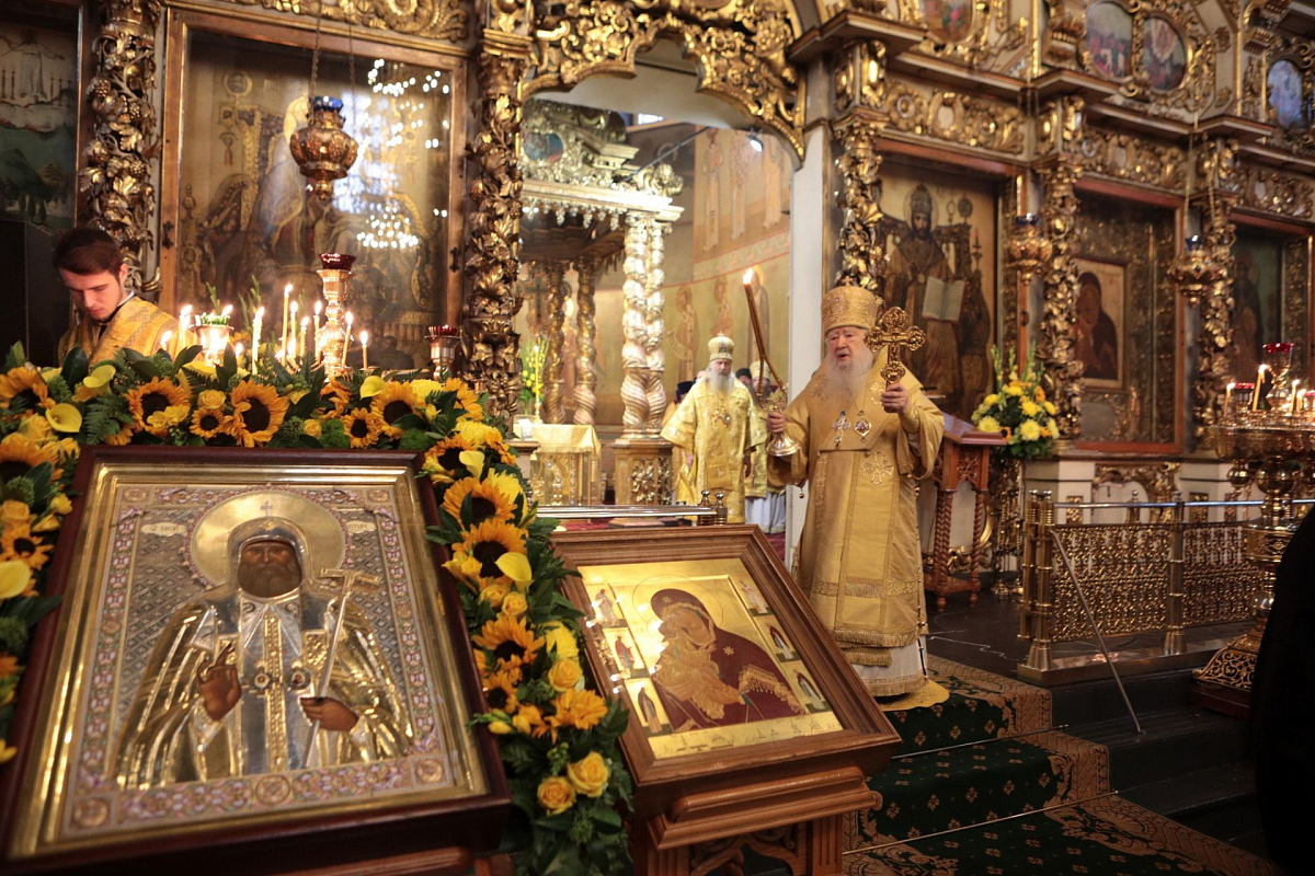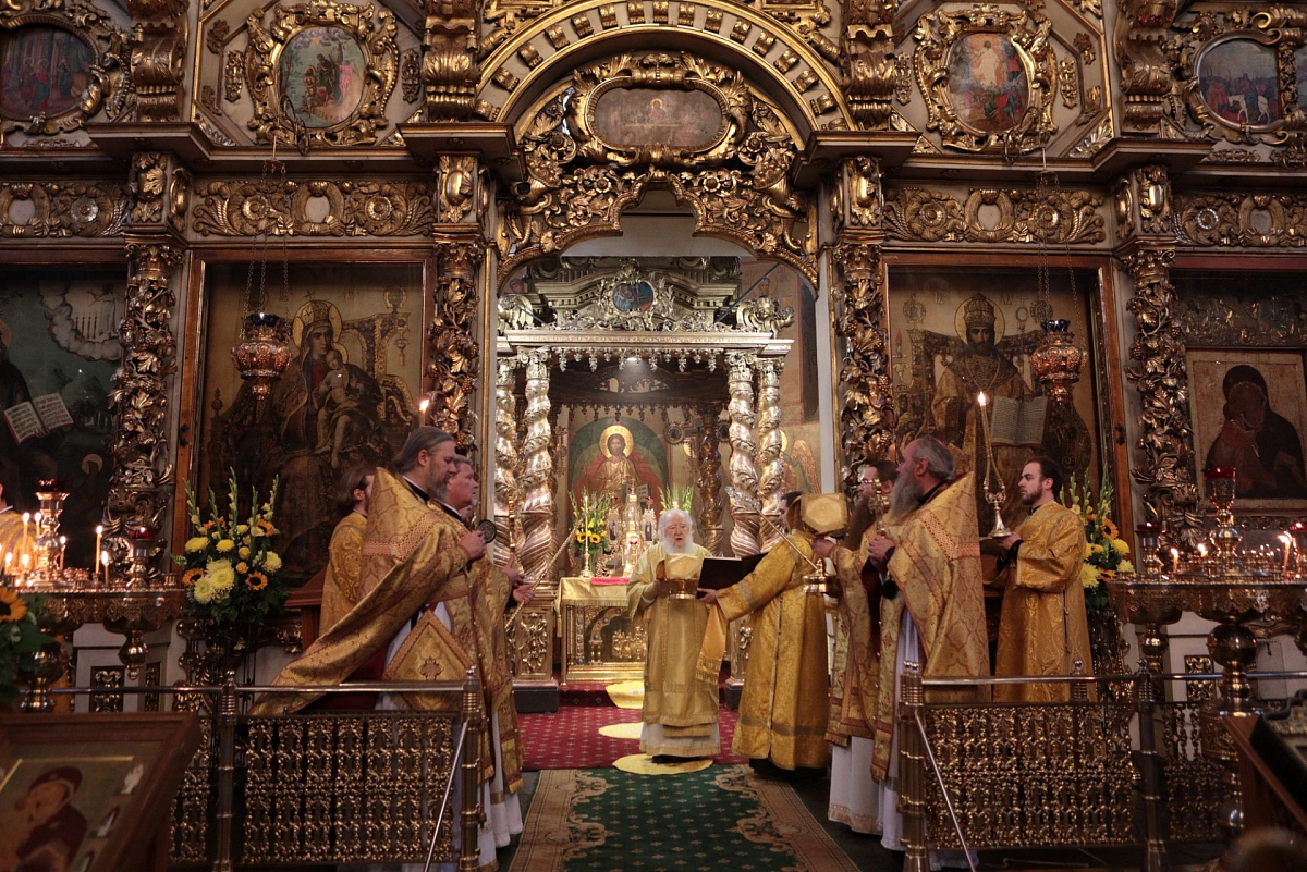 Мы имели сегодня радость по благословению Святейшего Патриарха Кирилла соборно совершить Божественную литургию в этом историческом соборе у мощей святителя Тихона, Патриарха Всероссийского. Сегодня исполнилось ровно тридцать лет с того события, когда в нашей Церкви отмечалось 400-летие восстановления автокефалии. На Архиерейском Соборе 1989 года было принято решение о причислении Предстоятеля нашей Церкви Святейшего Патриарха Тихона к лику святых. Много милости Божией мы получаем через его молитвенное предстательство!