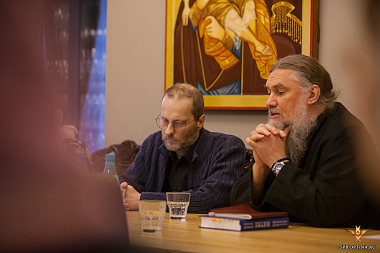 Представляя гостей всем собравшимся прихожанам, отец Арсений сказал, что на подворье готовится к изданию «Добротолюбие» в переводе прп. Паисия (Величковского), составителем которого является известный исследователь Петр Борисович, поддерживается тесное сотрудничество и с Верой Григорьевной и что живое общение и совместное чтение жизнеописания старца очень значимы для всех сегодня собравшихся.