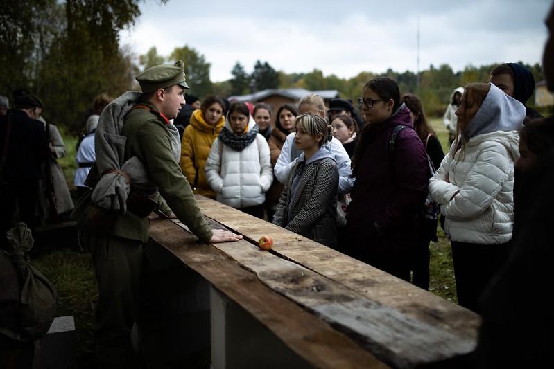 «Наше мероприятие мы называем именно уроком, оно отличается от других военно-исторических реконструкций и построено по принципу школьного урока. В этом году мы взяли за основу город Богучар в 1918 году. Именно в Богучаре ярко выражен весь ужас братоубийственного противостояния. Четыре раза в городе менялась власть, его занимали также и немецкие интервенты как раз тогда, когда русские солдаты воевали друг с другом. Важно заметить, что обе противоборствующие стороны любили Родину, но при этом они убивали друг друга. Поэтому детям важно объяснить, что кроме любви к Родине нужен еще нравственный ориентир», – рассказал организатор и идейный вдохновитель открытого урока старший священник храма преподобного Сергия Радонежского в поселке Зеленоградский иерей Леонид Цапок.
