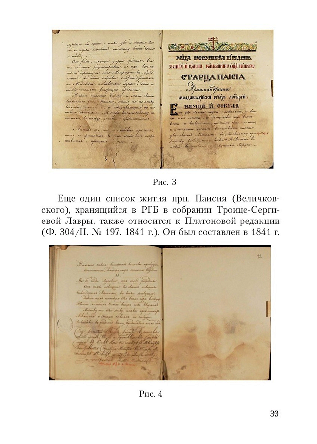 М.С. Крутова в исследовании «Рукописные материалы о преподобном Паисии (Величковском) в Отделе рукописей Российской государственной библиотеки» отмечает, что в отделах рукописей различных книгохранилищ до сих пор находятся документы, которые недостаточно известны широкому кругу читателей и ученых или вообще неизвестны, так как архивы постоянно пополняются новыми поступлениями. «В Отделе рукописей Российской государственной библиотеки (ОР РГБ) хранятся разнообразные рукописные материалы, содержащие сведения о житии и творениях прп. Паисия и его учеников. Среди них могут быть выделены тематические группы: 1) житие прп. Паисия (Величковского), 2) труды прп. Паисия (Величковского), 3) ученики прп. Паисия (Величковского); 4) труды разных авторов о сочинениях прп. Паисия (Величковского), 5) Зографские фрагменты», – пишет исследователь.