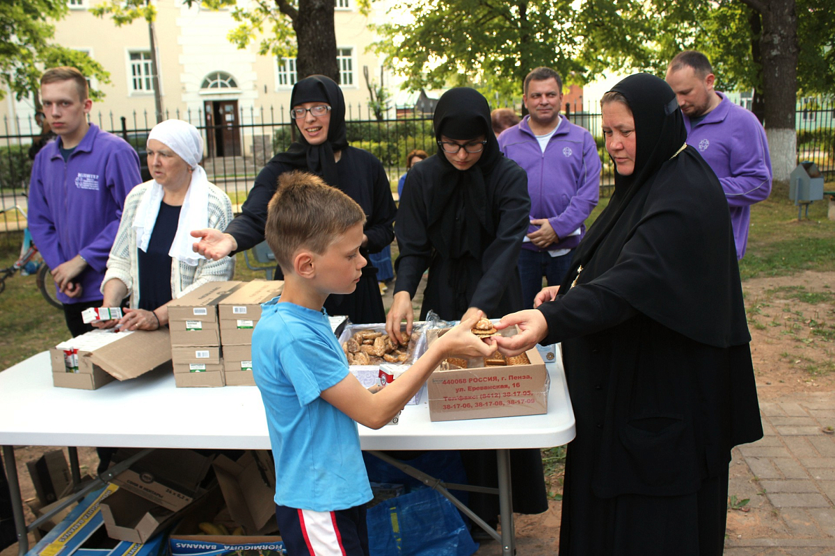«Уважаемая Татьяна Даниловна, – обратилась матушка Екатерина к директору Центра соцобслуживания Печорского района Т.Д. Травиной, – дети, родители! В эти жаркие летние дни мы приехали к вам, чтобы поздравить вас с тем праздником, который мы отмечаем всегда летом. Праздник Крещения Руси – 28 июля. Это день памяти святого равноапостольного князя Владимира, который крестил Русь и является нашим земляком. Он родился на Псковской земле, и потому мы с вами сделали праздник, посвященный святым земли Псковской.