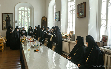 За праздничной трапезой матушку Сергию поздравила игумения Филарета: