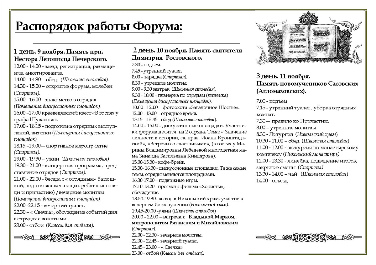 Третий день форума начался Божественной воскресной литургией в Никольском храме обители. Клирику монастыря протоиерею Владимиру Постникову сослужили священники Рязанской епархии, участники форума. За богослужением подростки приступали к таинствам Исповеди и Святого Причащения. После обеда для всех участников форума были проведены экскурсии по Никольскому Шостьенскому ставропигиальному женскому монастырю.