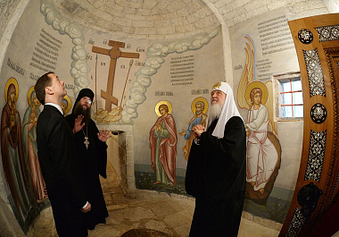Затем Святейший Патриарх Кирилл и Д.А. Медведев в сопровождении архимандрита Феофилакта (Безукладникова) и членов Попечительского совета осмотрели Воскресенский собор и другие здания Ново-Иерусалимского монастыря.