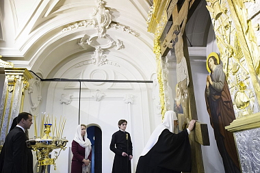 По прибытии в Воскресенский собор, который является копией Воскресенского собора во Святом Граде Иерусалиме, Предстоятель Русской Православной Церкви поклонился Гробу Господню в Кувуклии ротонды и приветствовал верующих пасхальным приветствием «Христос воскресе!»