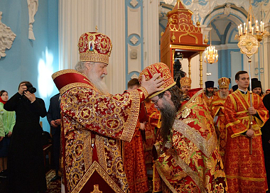 На малом входе за многолетние труды по восстановлению монастыря Святейший Патриарх Кирилл возвел игумена Феофилакта (Безукладникова), наместника Воскресенского Ново-Иерусалимского ставропигиального мужского монастыря, в сан архимандрита.
