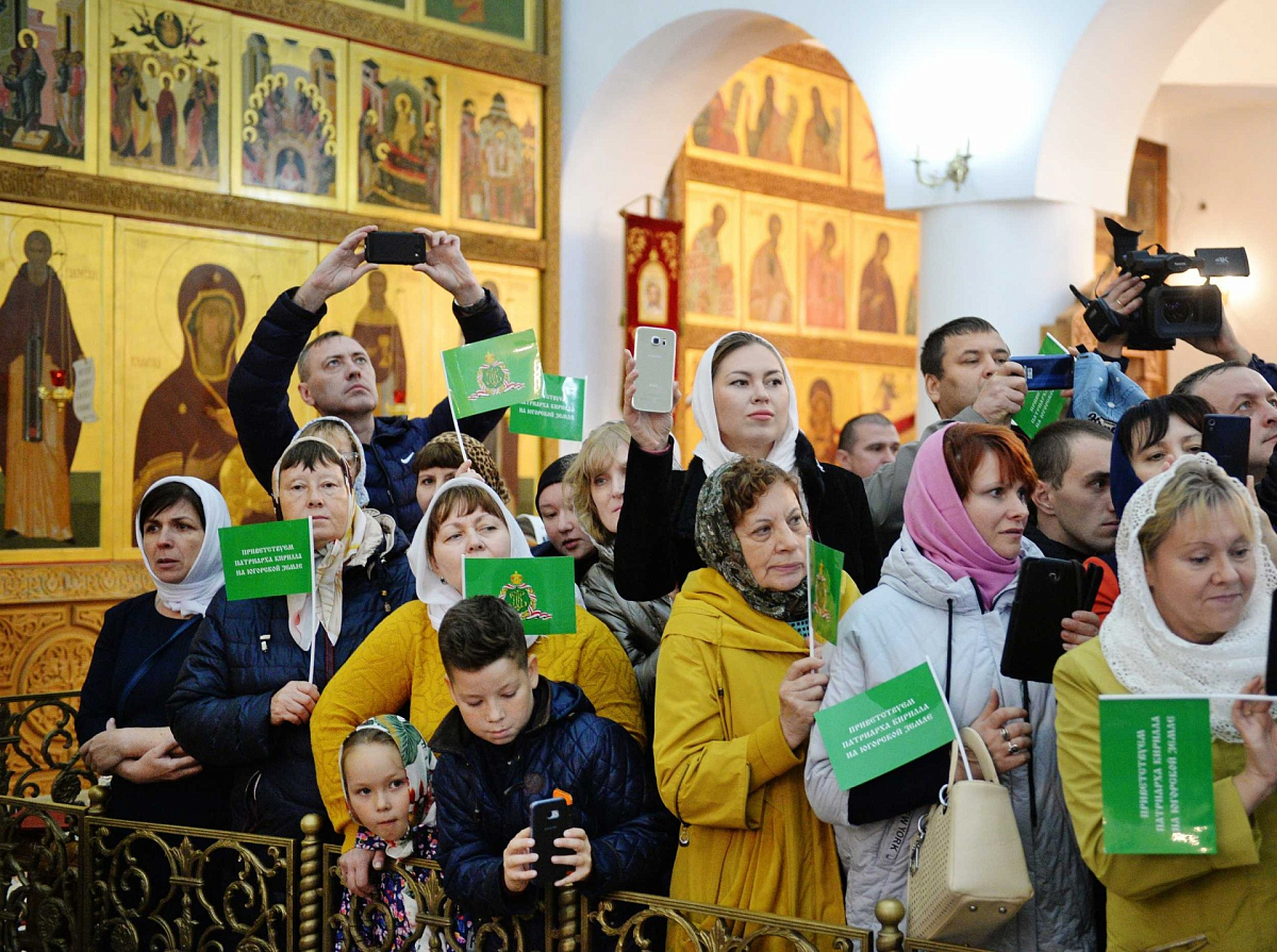 Святейшего Владыку сопровождали: митрополит Санкт-Петербургский и Ладожский Варсонофий, управляющий делами Московской Патриархии; митрополит Волоколамский Иларион, председатель Отдела внешних церковных связей; митрополит Ханты-Мансийский и Сургутский Павел; архиепископ Солнечногорский Сергий, руководитель Административного секретариата Московской Патриархии; епископ Югорский и Няганский Фотий; протоиерей Николай Матвийчук, благочинный Нефтеюганского округа, настоятель храма Святого Духа г. Нефтеюганска; протоиерей Сергий Кравцов, благочинный Ханты-Мансийского округа, клирик храма Покрова Пресвятой Богородицы г. Ханты-Мансийска; духовенство Ханты-Мансийской митрополии. Также вместе с Его Святейшеством прибыл президент ПАО «Лукойл» В.Ю. Алекперов.