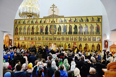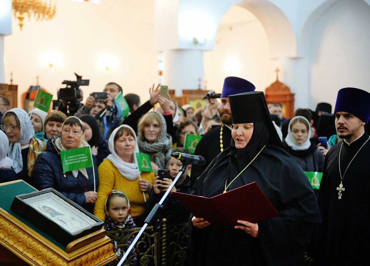 Святейшего Патриарха Кирилла встречали настоятельница Пюхтицкого ставропигиального монастыря игумения Филарета (Калачева), старшая сестра подворья Пюхтицкого монастыря в Когалыме монахиня Ксения (Вороная) и насельницы подворья.