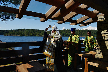 Предстоятель совершил славление и молитву основателям обители, поклонился честным мощам преподобных Сергия и Германа, чтимому списку Валаамской иконы Божией Матери и мощам преподобного Антипы Валаамского.