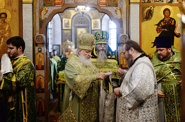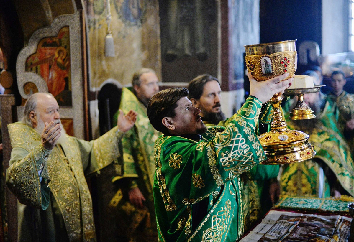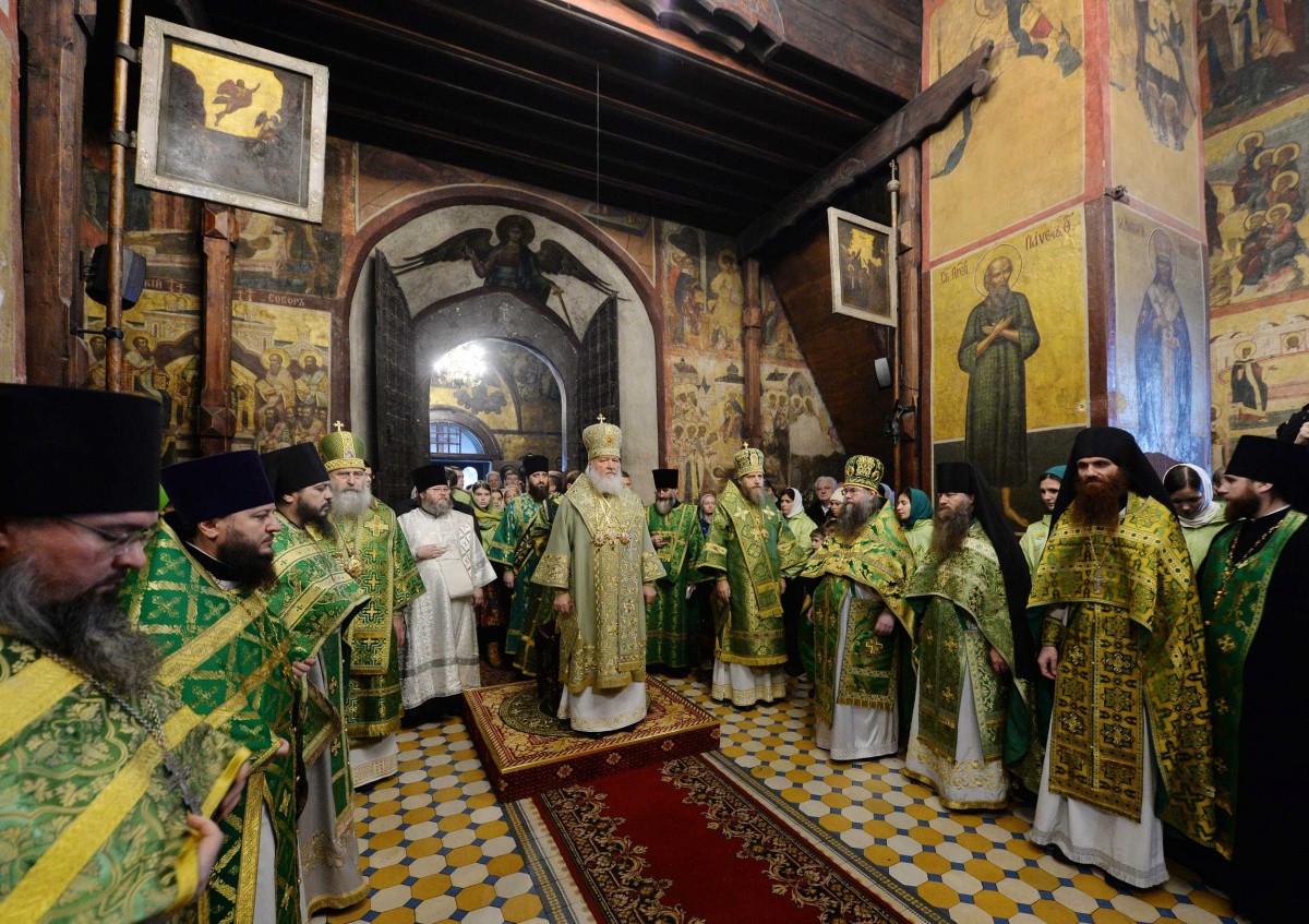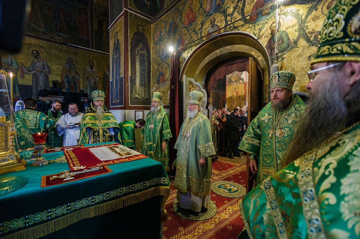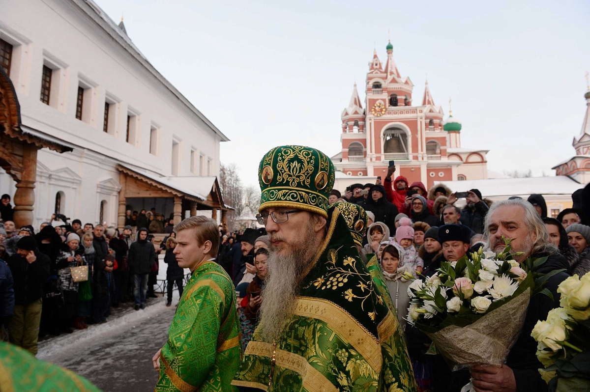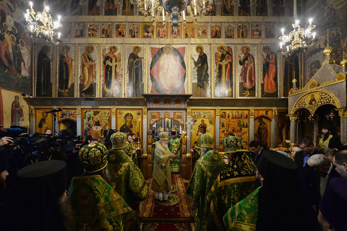 Его Святейшеству сослужили: архиепископ Сергиево-Посадский Феогност, председатель Синодального отдела по монастырям и монашеству, наместник Троице-Сергиевой лавры; епископ Домодедовский Иоанн, наместник Новоспасского ставропигиального монастыря; архимандрит Савва (Фатеев), наместник Саввино-Сторожевского ставропигиального монастыря; архимандрит Феофилакт (Безукладников), наместник Воскресенского Ново-Иерусалимского ставропигиального монастыря; архимандрит Сергий (Воронков), наместник Иосифо-Волоцкого ставропигиального монастыря; архимандрит Андрей (Листоверов), благочинный Ахтубинского округа, настоятель прихода Архистратига Божия Михаила г. Ахтубинска (Ахтубинская епархия Астраханской митрополии); протоиерей Николай Курдов, благочинный Звенигородского округа Московской областной епархии, настоятель Вознесенского собора г. Звенигорода; протоиерей Андрей Марущак, клирик кафедрального соборного Храма Христа Спасителя г. Москвы; насельники обители в священном сане; духовенство Московской епархии.