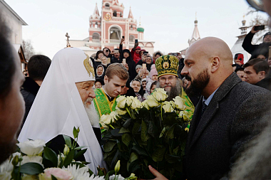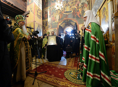 От лица участников торжеств наместник обители архимандрит Савва (Фатеев) приветствовал Предстоятеля и преподнес Его Святейшеству икону преподобного Саввы Сторожевского с житием.