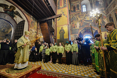 По прибытии в обитель Предстоятель Русской Православной Церкви поклонился честным мощам преподобного Саввы Сторожевского в древнем соборе Рождества Пресвятой Богородицы. Затем Святейший Владыка возглавил в этом храме Божественную литургию .