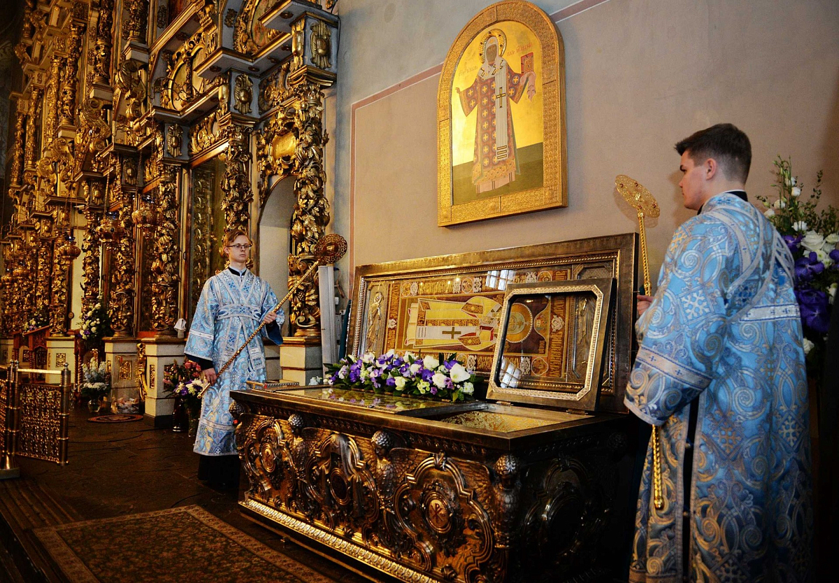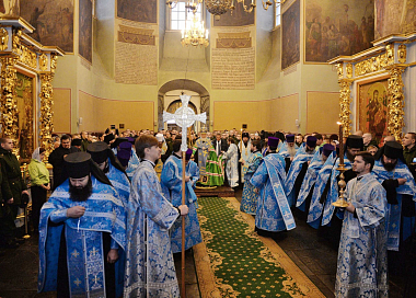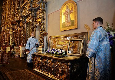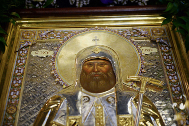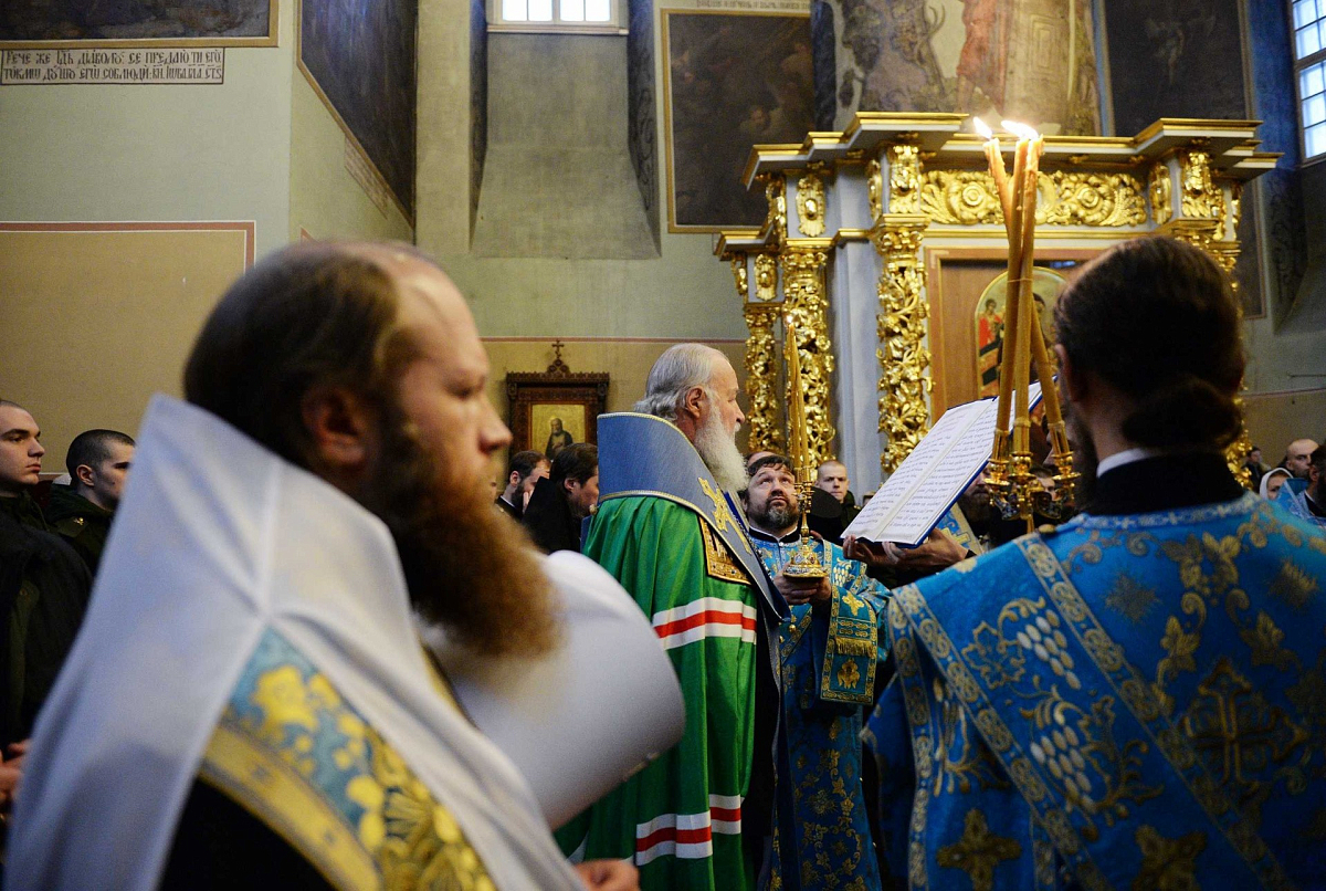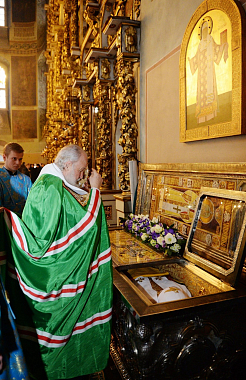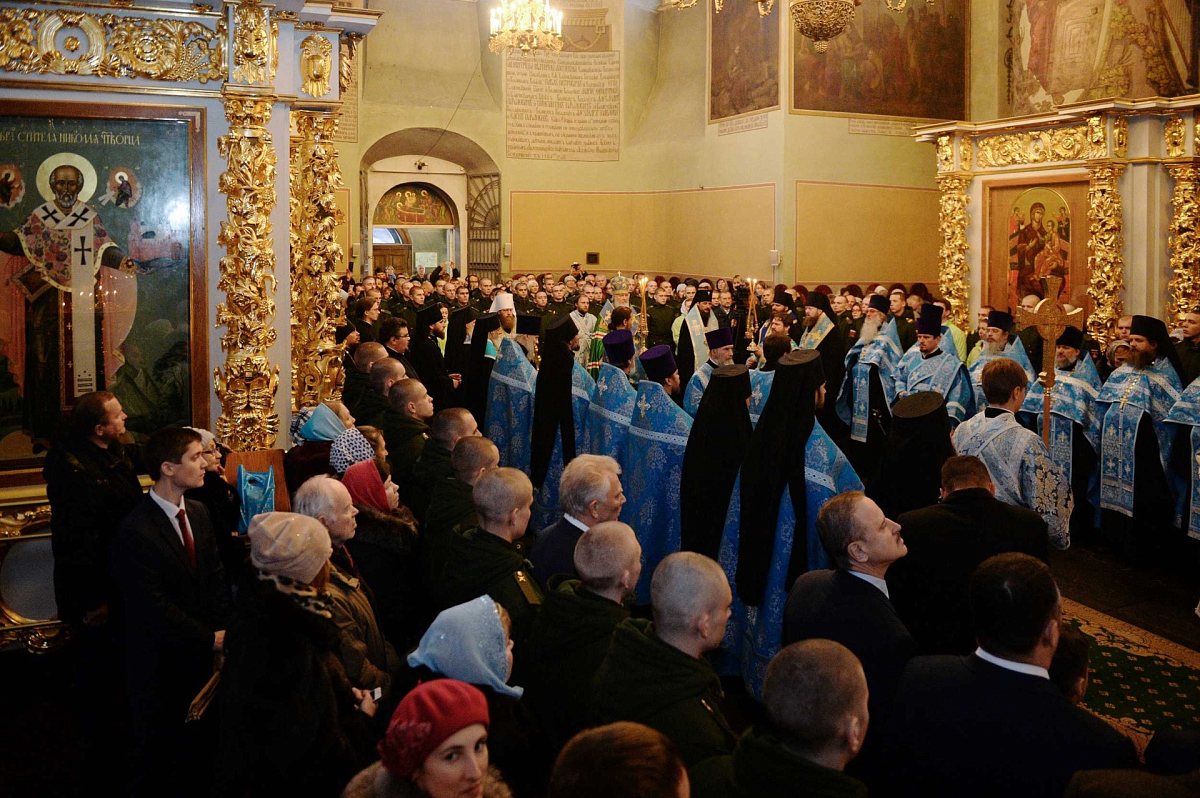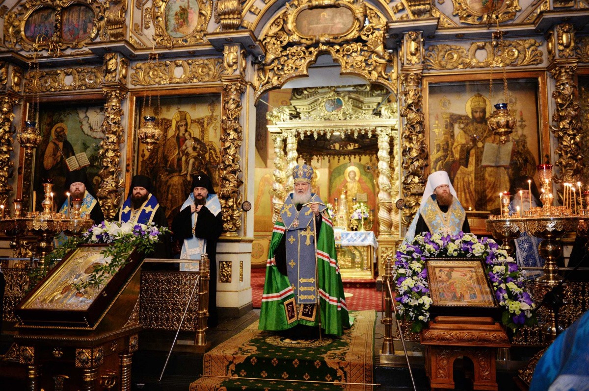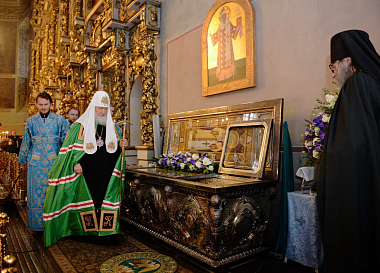 В Большом соборе обители, где покоятся честные мощи святителя Тихона, Святейший Патриарх Кирилл совершил молебен.