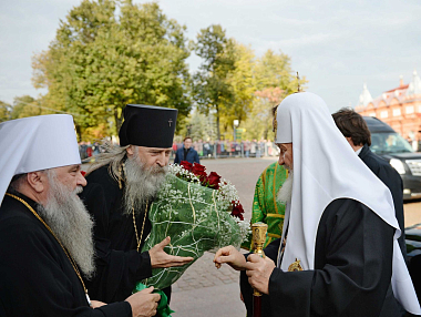 У святых врат Предстоятеля Русской Православной Церкви встречали: митрополит Санкт-Петербургский и Ладожский Варсонофий, управляющий делами Московской Патриархии; архиепископ Сергиево-Посадский Феогност, председатель Синодального отдела по монастырям и монашеству, наместник Троице-Сергиевой лавры; архиепископ Верейский Амвросий, ректор Московской духовной академии; архиепископ Солнечногорский Сергий, руководитель Административного секретариата Московской Патриархии; братия монастыря.