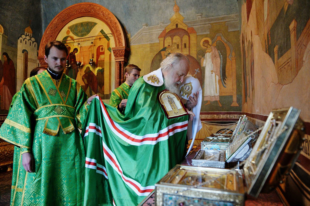 Святейший Владыка проследовал в Троицкий собор Лавры, где поклонился честным мощам преподобного Сергия Радонежского.