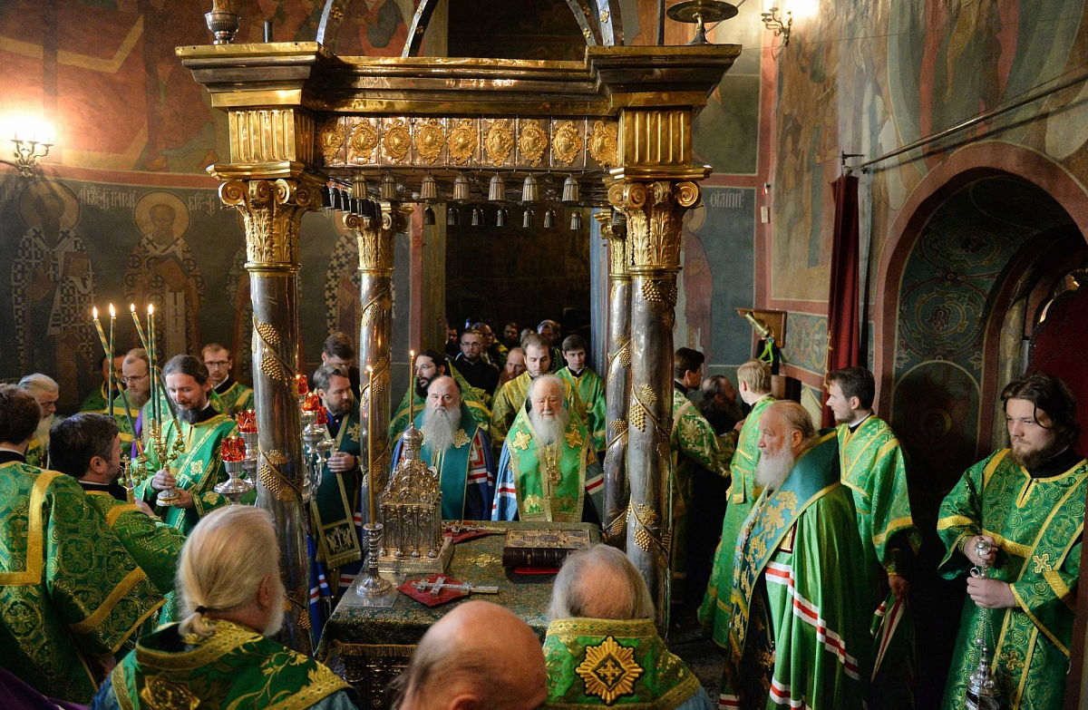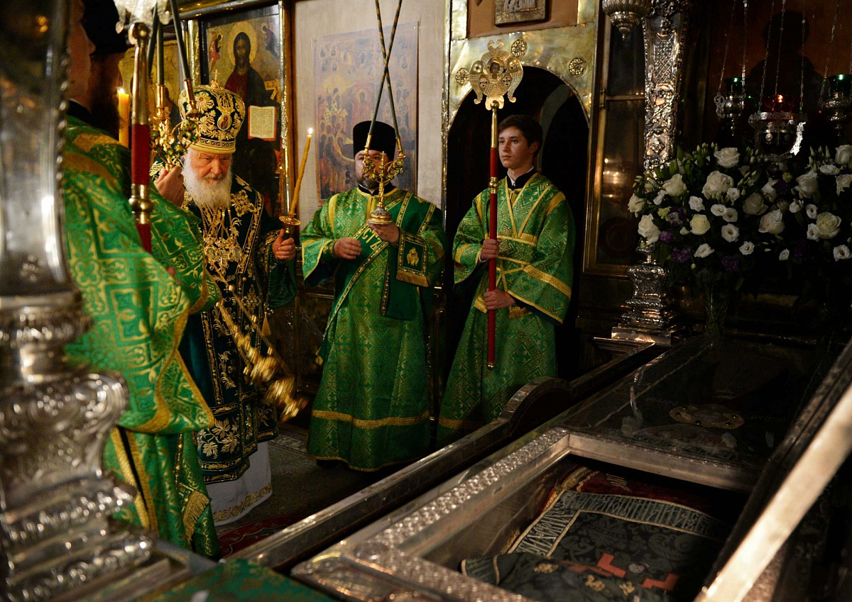 Его Святейшеству сослужили митрополит Бориспольский и Броварской Антоний, архиепископ Сергиево-Посадский Феогност, архиепископ Верейский Амвросий, епископ Наро-Фоминский Иоанн; архимандрит Павел (Кривоногов), благочинный Троице-Сергиевой лавры; сонм духовенства.