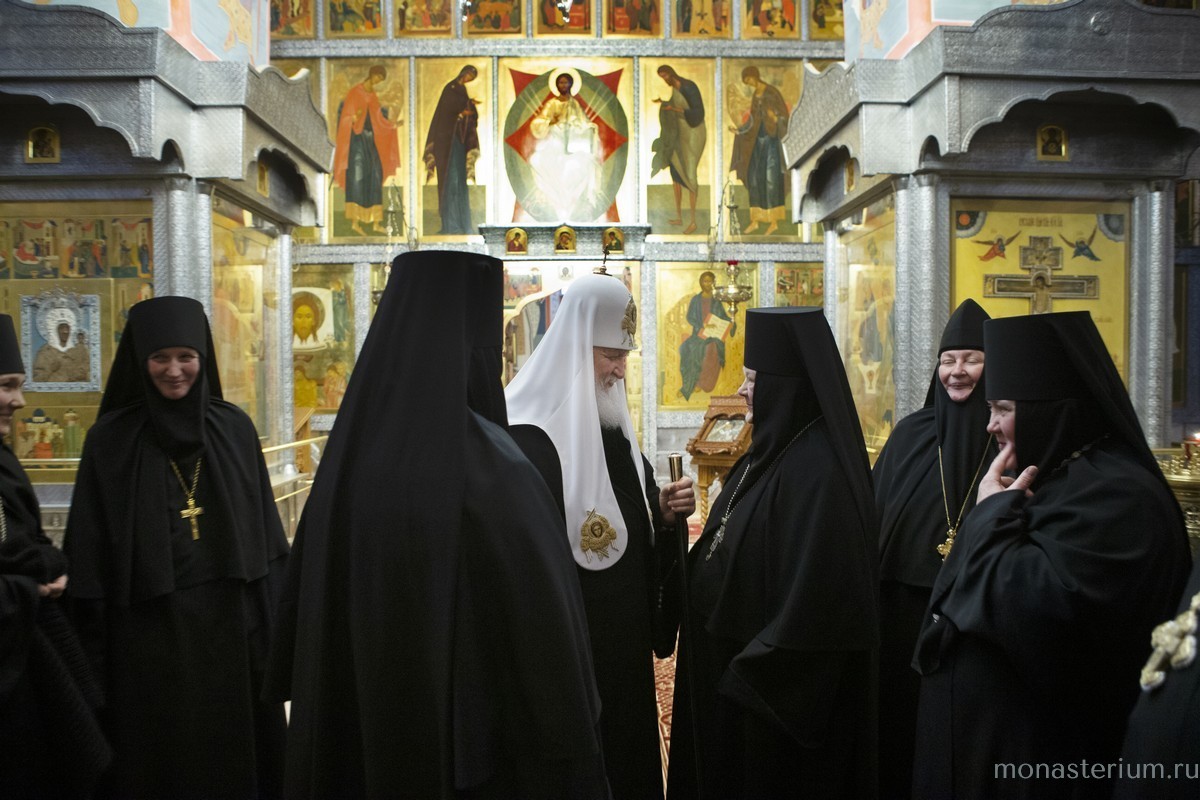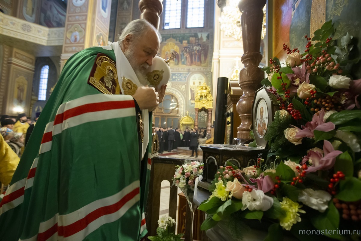 По прибытии в собор Предстоятель Русской Православной Церкви поклонился святыням обители (в соборе хранится ковчег с частицей мощей святителя и чудотворца Николая и покоятся честные мощи преподобного Пимена Угрешского), а затем возглавил служение Божественной литургии.
