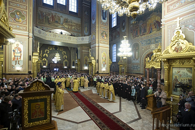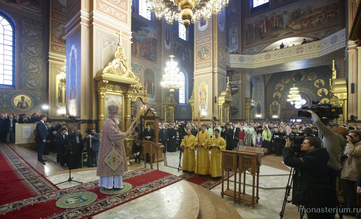 После сугубой ектении Святейший Патриарх Кирилл совершил молитву о мире на Украине, а также молитву о заключенных: «Господи, Иисусе Христе, Боже наш, Крестом во ад сошедый, диавола посрамивый, заклепы и вратницы адовы разрушивый, узники свободивый и жизнь миру Твоему даровавый, призри на молитву смиренных и недостойных раб Твоих, ко Твоему Величеству бесприкладному и бездне человеколюбия прибегающих и яко Благосерд Твоею милостию и щедротами посети грехми обремененныя и в заключении темничном сущия: Ты бо рекл еси, Господи, яко хотением не хощу смерти грешника, но еже обратитися и живу быте ему. Услыши в скорби и тесноте душевной призывающих Тя: в немощи находящихся душевныя и телесныя их раны уврачуй; в ожесточении сердечном сущия к покаянию обрати; правды и оправданий Твоих ищущих в вере и творении заповедей утверди и на путь спасения настави. Ты бо еси, Господи, помощь беспомощным, надеждо ненадежным, спасение отчаянным, всем вся буди и приведи ко пристанищу хотения Твоего. Да поем и славим Тя со Безначальным Твоим Отцем, и Пресвятым и Благим и Животворящим Твоим Духом ныне, и присно и во веки веков. Аминь».