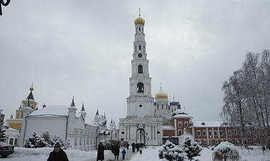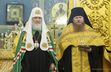 Наместник Николо-Угрешского монастыря игумен Варфоломей (Петров) приветствовал Святейшего Владыку и преподнес Его Святейшеству икону преподобного Серафима Саровского.