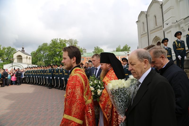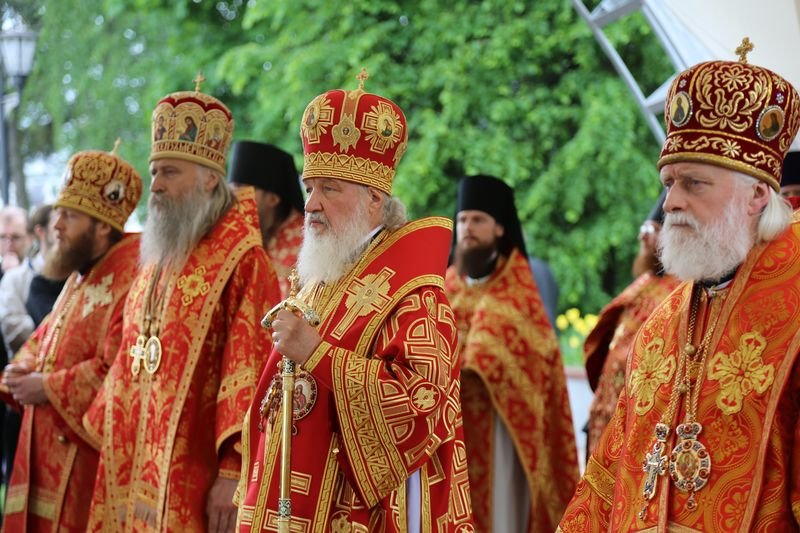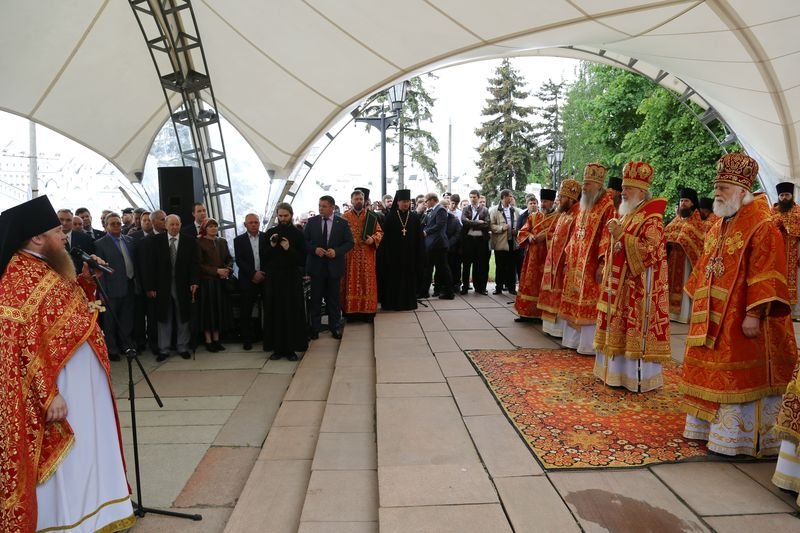 По окончании Литургии состоялся крестный ход из Преображенского собора обители на площадь святителя Николая. У памятника святителю Святейший Владыка совершил молебен.