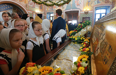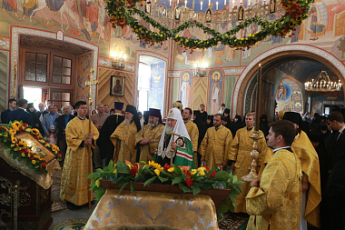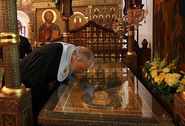 В завершение Святейший Патриарх Кирилл посетил Стефановский храм, где поклонился честным мощам преподобного Стефана Махрищского.