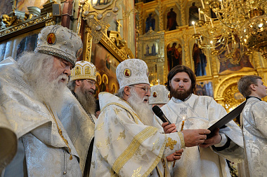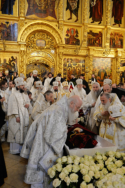 В состоявшемся затем богослужении участвовали: Блаженнейший митрополит Киевский и всея Украины Онуфрий; митрополит Ташкентский и Узбекистанский Викентий, глава Среднеазиатского митрополичьего округа; митрополит Волоколамский Иларион, председатель Отдела внешних церковных связей Московского Патриархата; митрополит Владимирский и Суздальский Евлогий; митрополит Саратовский и Вольский Лонгин; митрополит Черновицкий и Буковинский Мелетий; митрополит Саранский и Мордовский Зиновий; архиепископ Керченский Анатолий; архиепископ Верейский Евгений, ректор Московской духовной академии, председатель Учебного комитета Русской Православной Церкви; архиепископ Сергиево-Посадский Феогност, наместник Троице-Сергиевой лавры, председатель Синодального отдела по монастырям и монашеству; архиепископ Петергофский Амвросий, ректор Санкт-Петербургской духовной академии; епископ Шумский Серафим; епископ Дмитровский Феофилакт, наместник Андреевского ставропигиального мужского монастыря; епископ Троицкий Панкратий, наместник Спасо-Преображенского Валаамского ставропигиального мужского монастыря, председатель Синодальной комиссии по канонизации святых; епископ Рыбинский и Даниловский Вениамин; епископ Щигровский и Мантуровский Паисий; епископ Волынский и Луцкий Нафанаил; епископ Бронницкий Парамон, наместник Донского ставропигиального мужского монастыря; схиархимандрит Илий (Ноздрин); архимандрит Алексий (Поликарпов), наместник Данилова ставропигиального мужского монастыря; архимандрит Порфирий (Шутов), наместник Спасо-Преображенского Соловецкого ставропигиального мужского монастыря; игумен Петр (Еремеев), наместник Высоко-Петровского ставропигиального мужского монастыря; многочисленное духовенство.