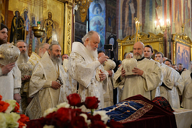 Перед началом чина отпевания Святейший Патриарх Кирилл произнес слово, посвященное памяти отца Кирилла:
