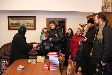 Юные паломники встретились с настоятельницей обители игуменией Олимпиадой (Барановой) и преподнесли в дар изделия, изготовленные руками старшеклассников, и монастырский хлеб.