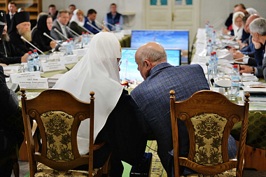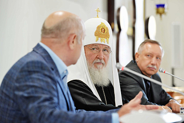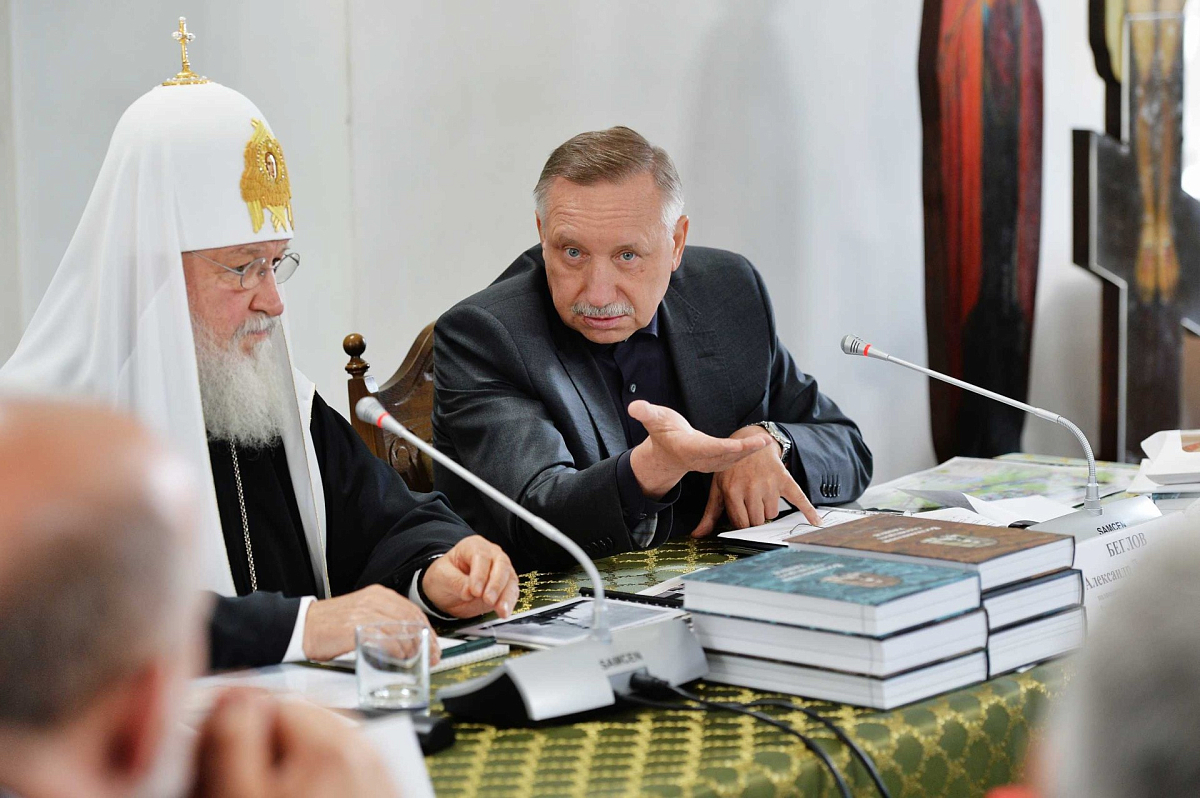 В президиуме заседания находились Святейший Патриарх Кирилл, полномочный представитель Президента РФ в Северо-Западном федеральном округе А.Д. Беглов, директор Российского института стратегических исследований, председатель Совета Фонда по сохранению и развитию Соловецкого архипелага М.Е. Фрадков.