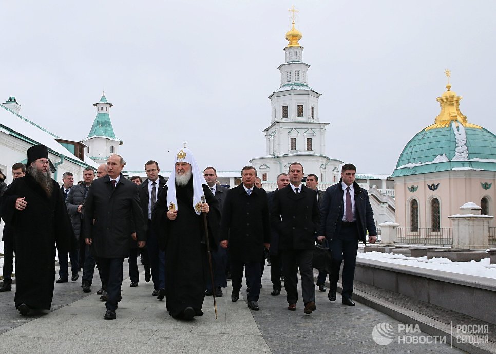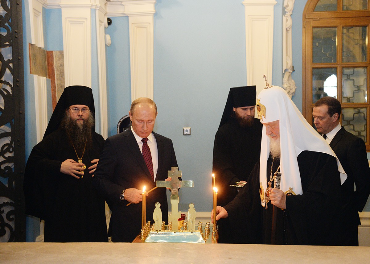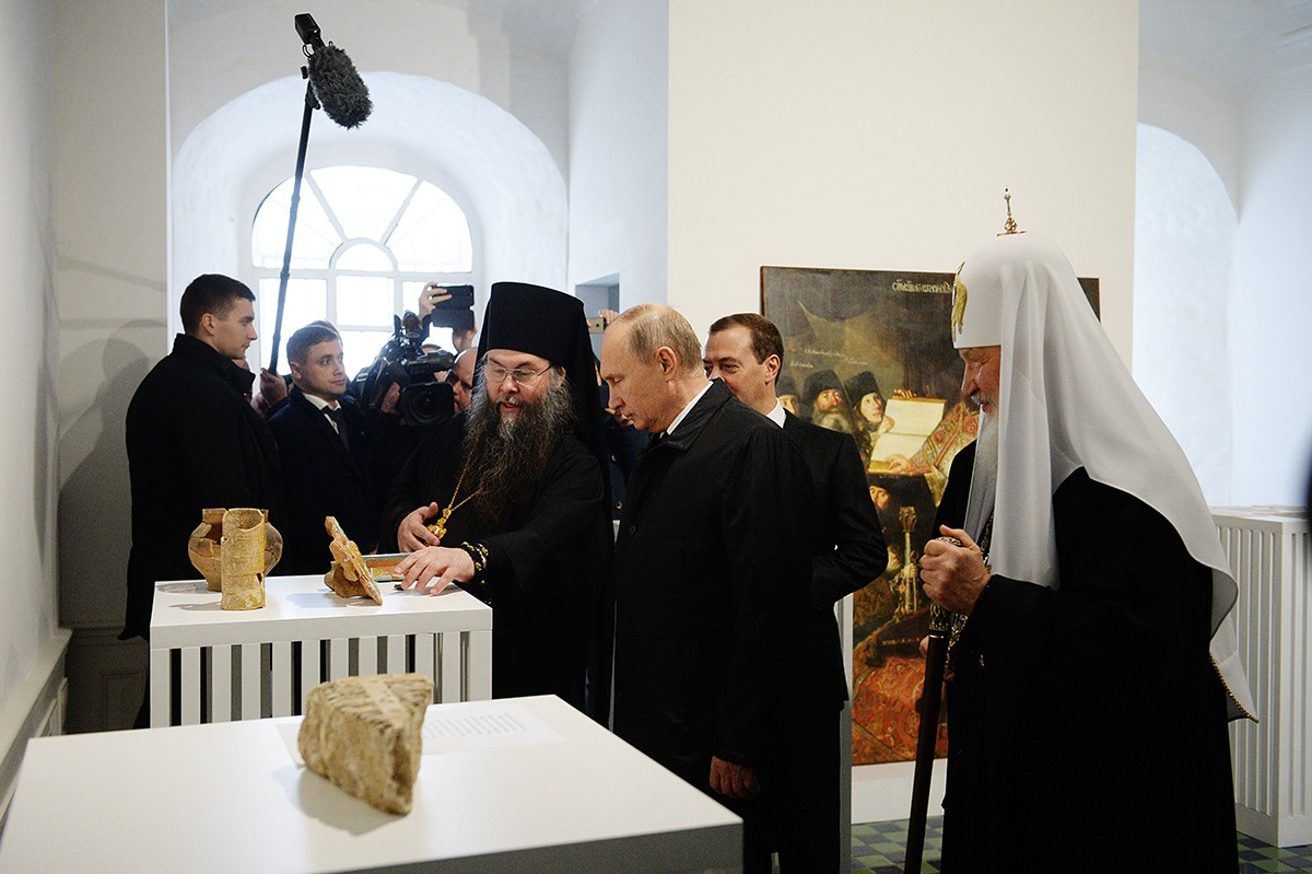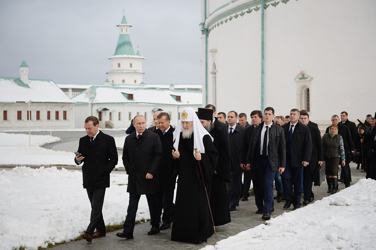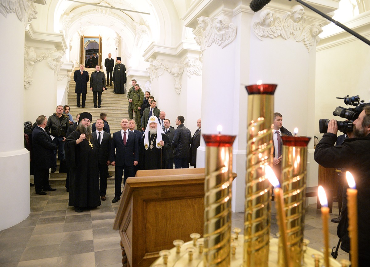 Главу государства сопровождали сопредседатели Попечительского совета Благотворительного фонда, на средства которого восстанавливается монастырь, премьер-министр Дмитрий Медведев и Патриарх Московский и всея Руси Кирилл.