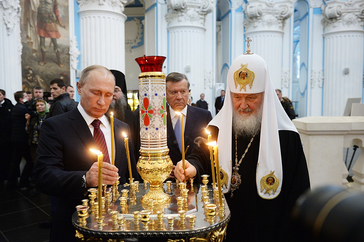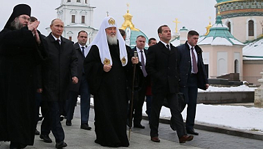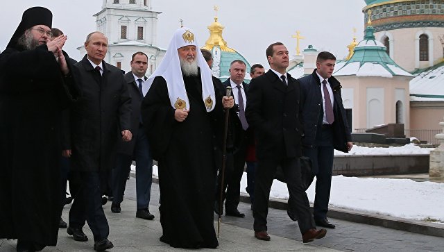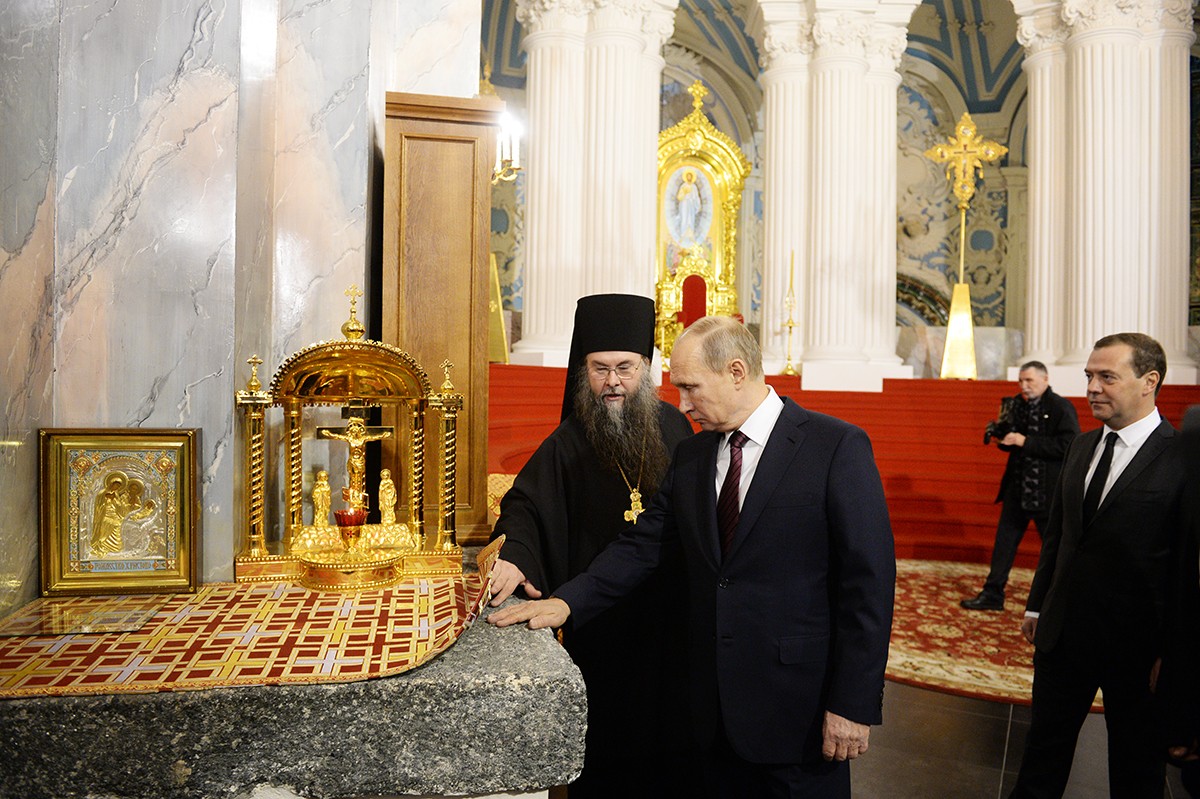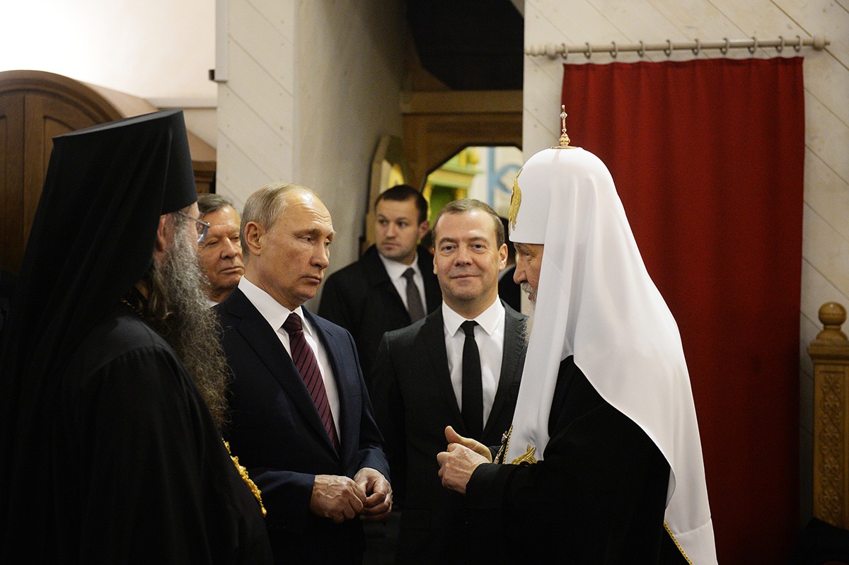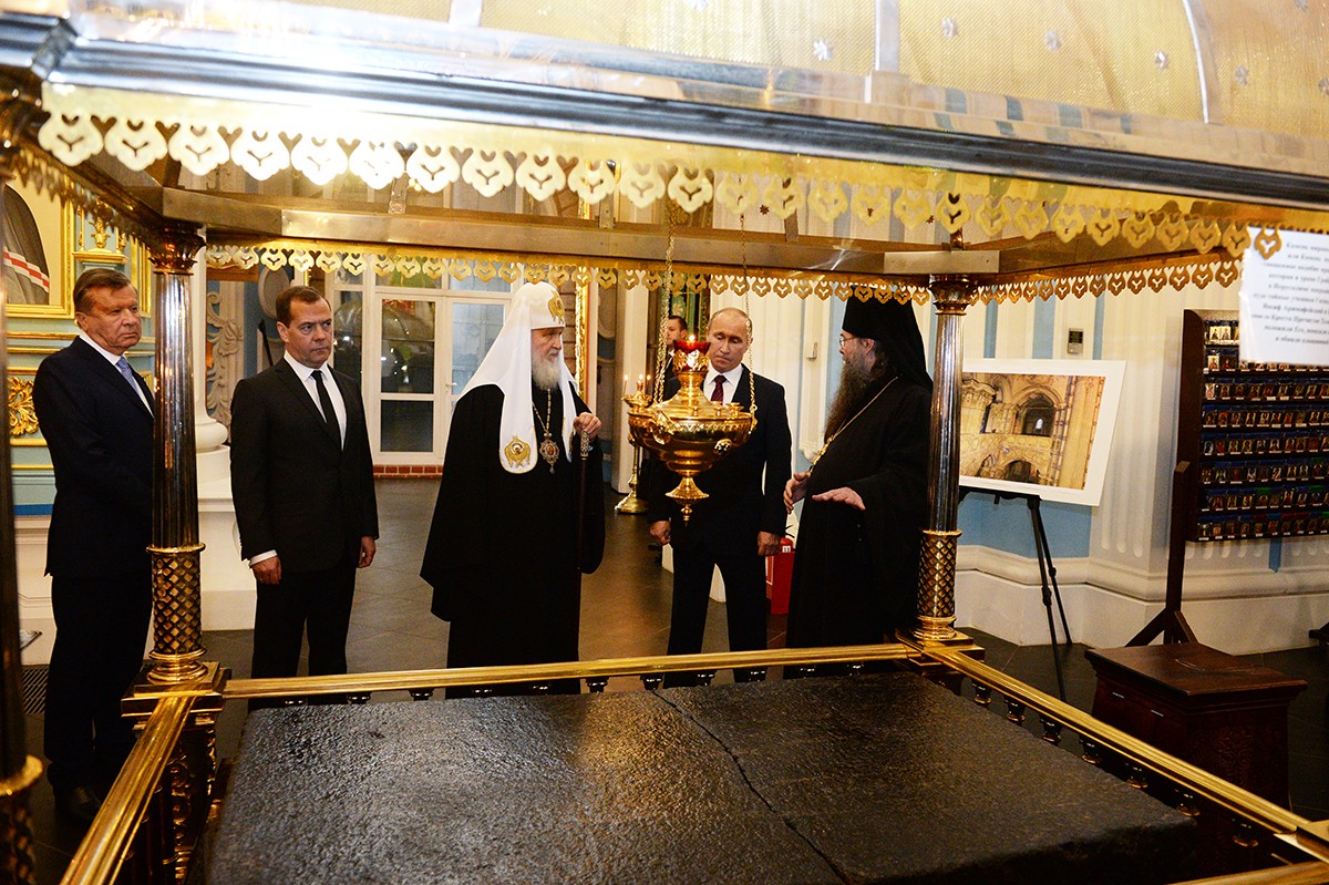 Главу государства сопровождали сопредседатели Попечительского совета Благотворительного фонда, на средства которого восстанавливается монастырь, премьер-министр Дмитрий Медведев и Патриарх Московский и всея Руси Кирилл.