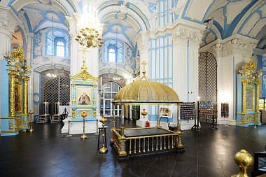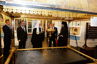 Экскурсию для гостей провел настоятель обители архимандрит Феофилакт (Безукладников). В Воскресенском соборе он провел Президента по нескольким приделам, которые выстраивались членами императорской фамилии в честь восшествия на престол или рождения наследника. В.В. Путин, Д.А. Медведев и Патриарх Кирилл спустились в подземную церковь, где осмотрели сохранившийся с прежних веков иконостас, а также попробовали святой воды из монастырского источника. Архимандрит Феофилакт обратил внимание на место погребения супруги прославленного полководца Александра Суворова, а также его сына. «Сын, как и отец, был генералом, как и отец, бился с турками, как и отец, победил их там, но сам утонул, спасая денщика», – рассказал настоятель обители.